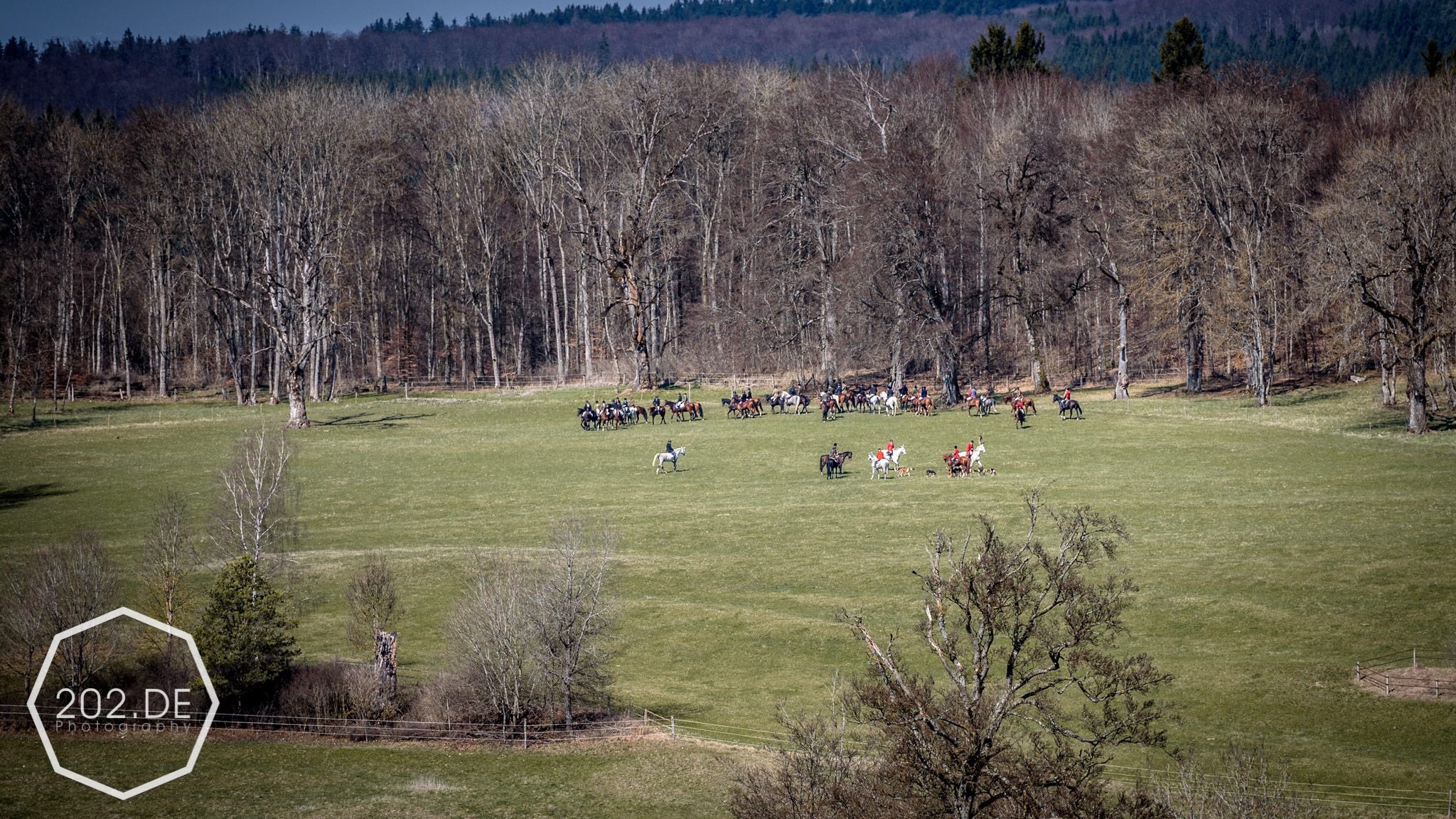 Erneut überquerten wir die Straße und dann ging es mit einem letzten „gute Jagd“ zur abschließenden Schleppe durch den „Eichelesgarten“ mit seinen Sprüngen, bis hin zur Anhöhe beim Sommerstall und der „Halaliwiese“.