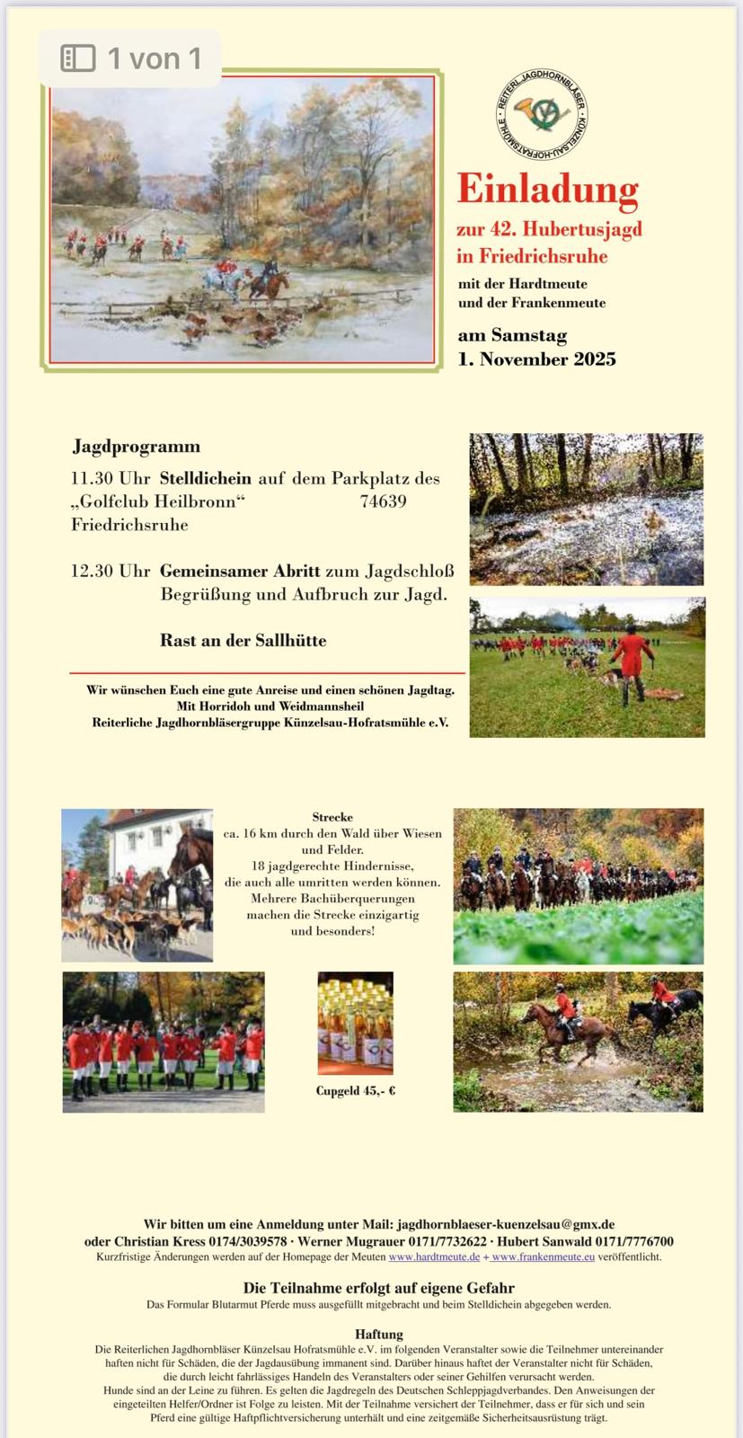 Kurzfristige Änderungen werden auf der Homepage der Hardtmeute www.wp.hardtmeute.de und www.frankenmeute.eu veröffentlicht.