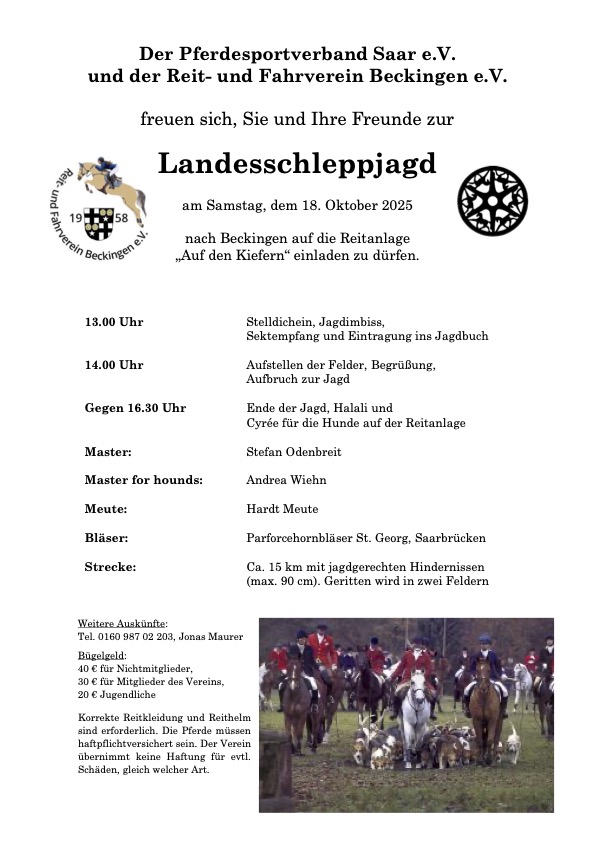 Am Samstag, 18. Oktober lädt der Reit- und Fahrverein Beckingen zur Landessschleppjagd hinter den Hunden der Hardt Meute ein!